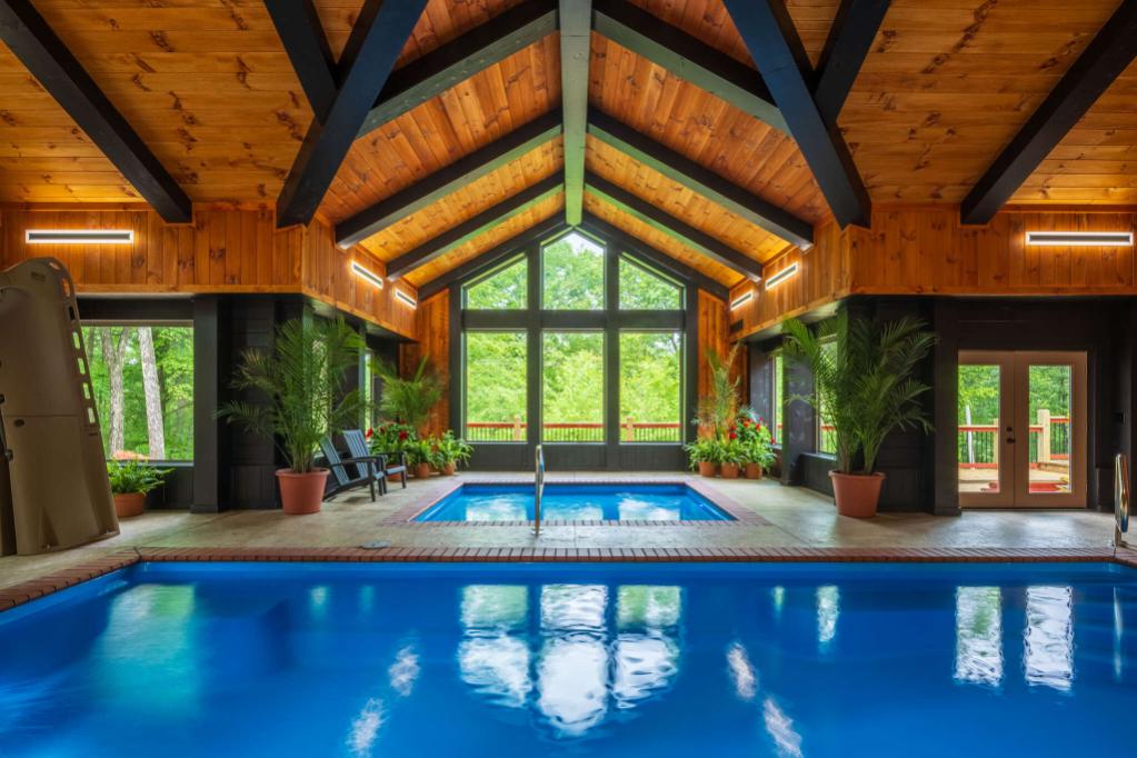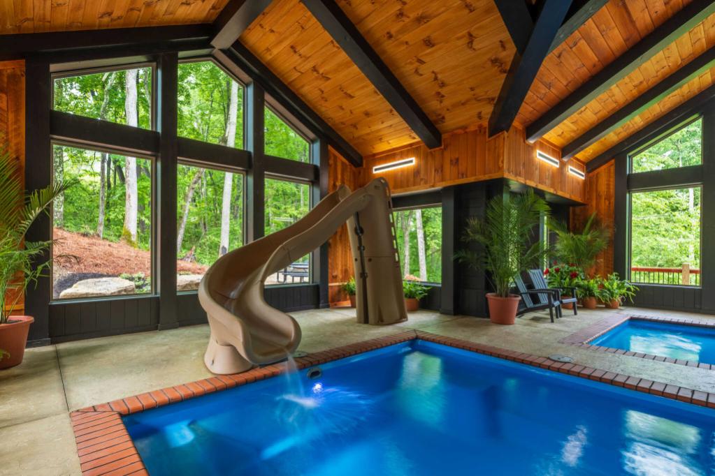 read more Our newest addition, 2 indoor saltwater pools featuring a thrilling water slide and a safe kiddie wading pool for year-round fun. The dining area boasts a custom square table with a one-of-a-kind tree stump base, seating 12, complemented by an additional island for buffet-style dining or extra 4 places. The great room invites relaxation with a plush leather sectional on both levels, perfect for sharing moments together.read less