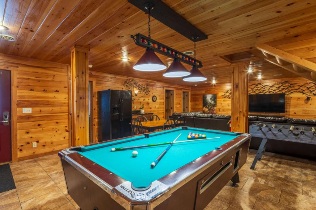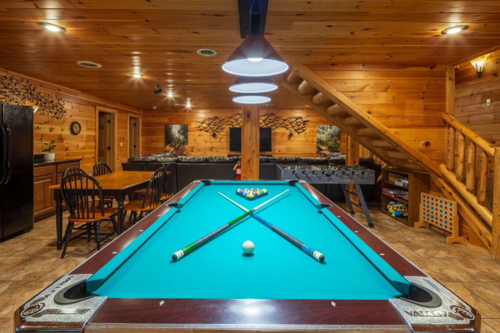 Inside, the fun continues with a game room boasting a pool table and foosball, plus large pit sectional sofas that offer ample room for lounging together. These playful spaces furnish opportunities for friendly competition as well as cozy gatherings, reinforcing the spirit of family togetherness.read less