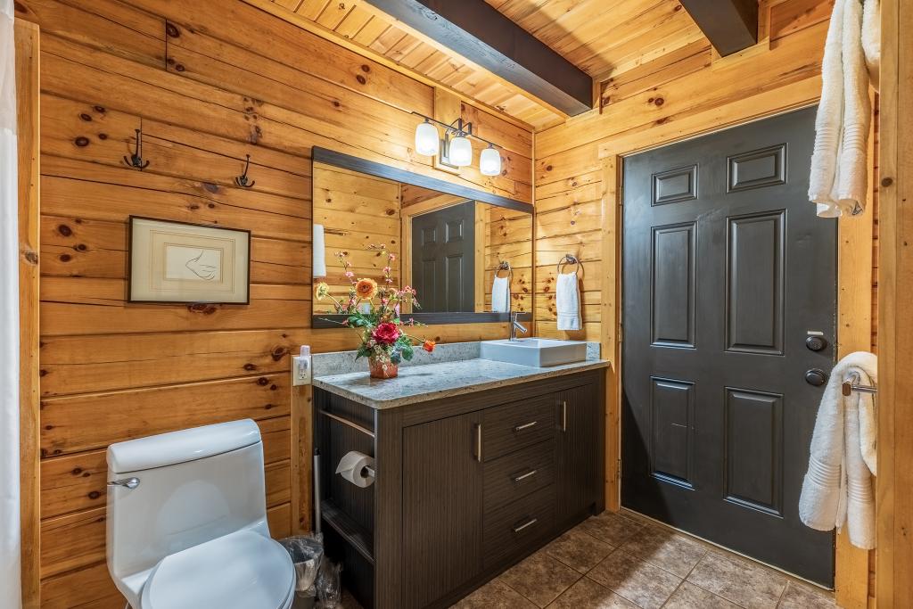 Step outside to the back deck, where you can unwind in the eight-person hot tub or gather around the outdoor fire pit, with firewood available for those cool evenings. Relax by the picnic tables and embrace the beauty of nature, with two covered decks providing additional outdoor spaces. The main floor is thoughtfully designed to accommodate guests with mobility needs, featuring a wheelchair-accessible ramp from the parking lot.